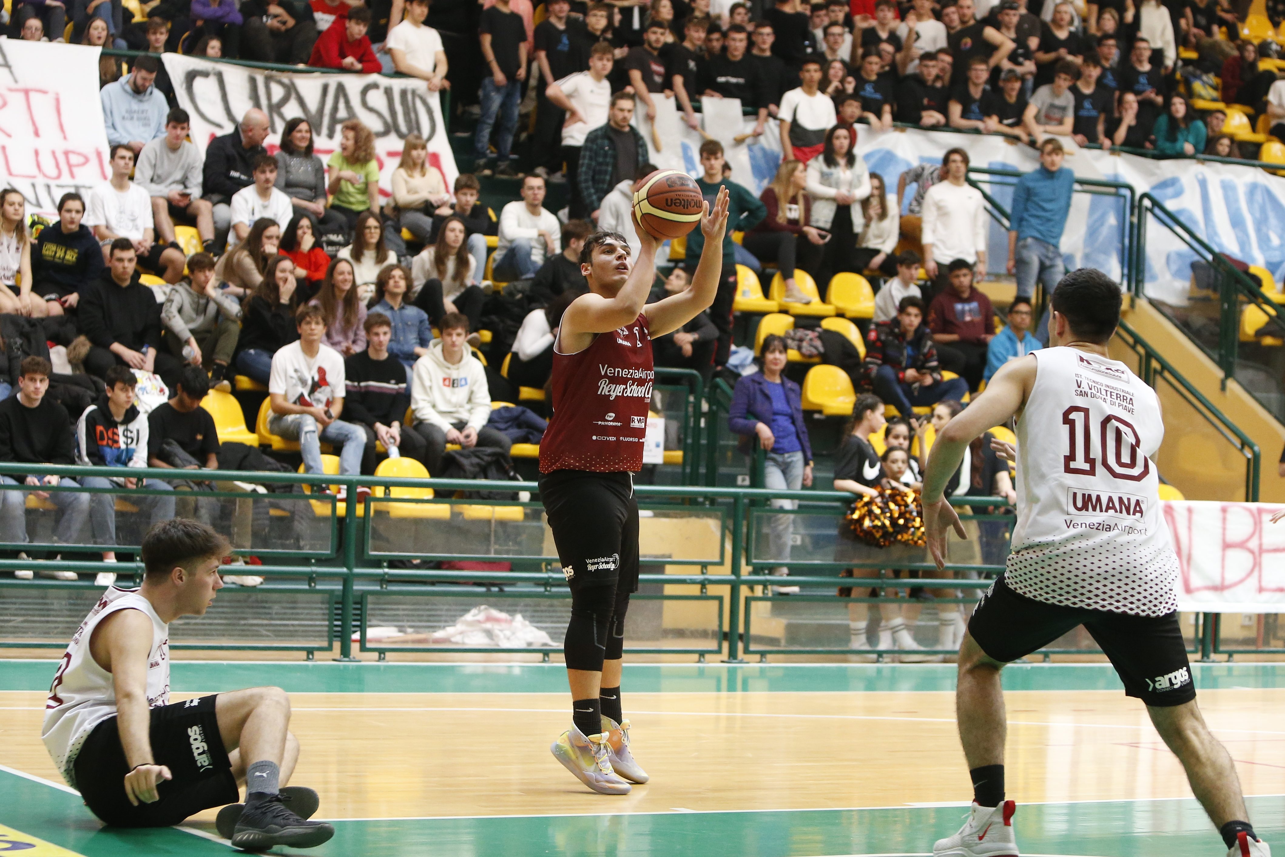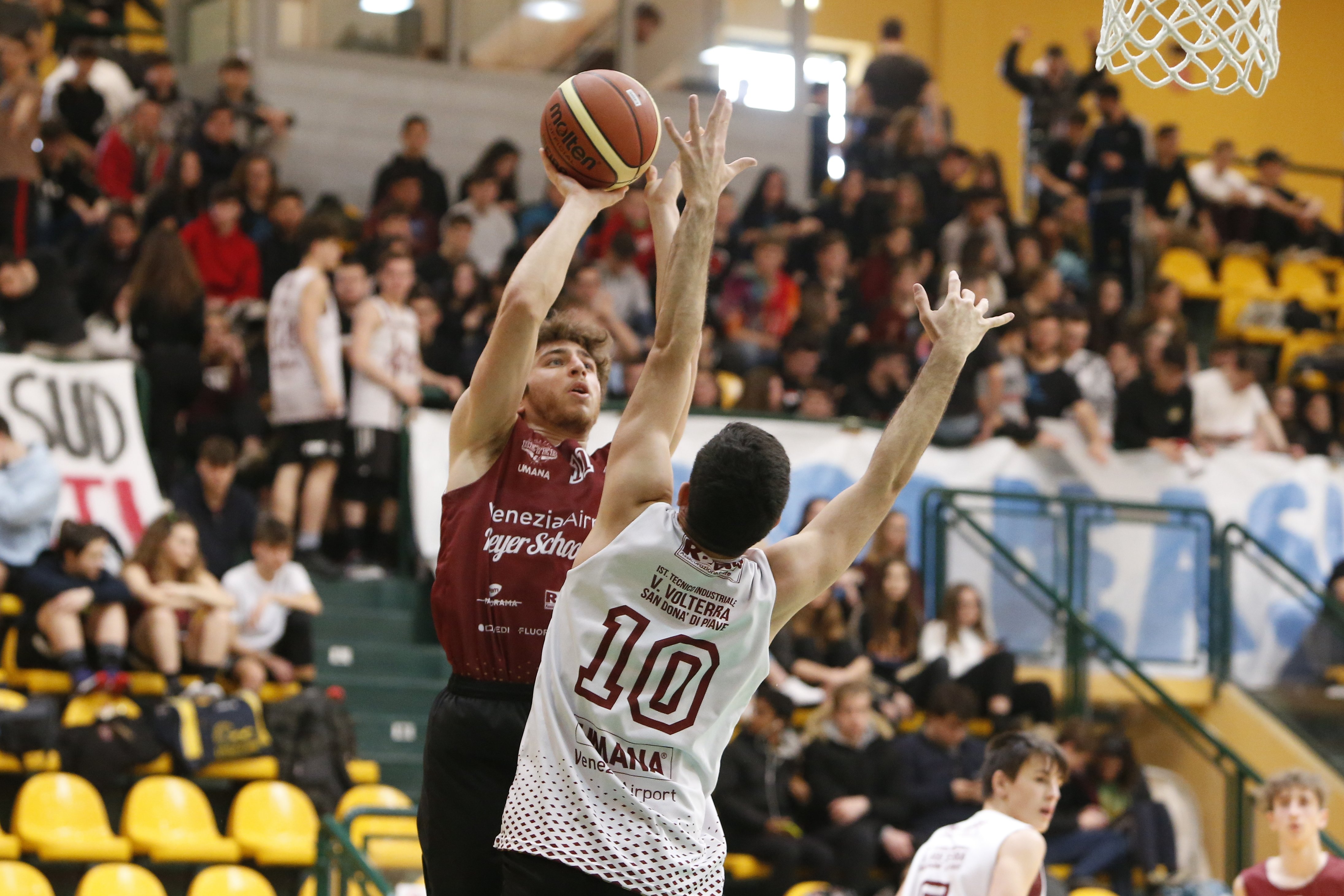 Ancora un arrivo in volata chiude i giochi qualificazione della tappa Ducale Jesolo. Il Volterra batte 32-30 il Cornaro e si giocherà con l’Alberti il primo posto, con le due scuole però già sicure di accedere alla fase Reyer Madness. Nonostante la vera e propria bolgia dei tifosi del Cornaro, il Volterra sfrutta la maggiore dotazione in centimetri e chili, portandosi sul 12-5 al 7’. Si segna comunque col contagocce e si va all’intervallo sul 12-7. Le difficoltà offensive continuano anche a inizio ripresa (14-9 al 13’), col Volterra che poi prova l’allungo (17-11 al 14’). Il Cornaro si riavvicina sul 20-19, poi nuovo allungo dei sandonatesi sul 25-20. Si arriva però al finale punto a punto, addirittura col sorpasso del Cornaro sul 27-29,. Volterra avanti 30-29 con la tripla di Tangherlini, poi 30-30 sul libero di Salso. A decidere, sul 32-30, è infine un canestro pazzesco di Mei dopo il time out Volterra.
