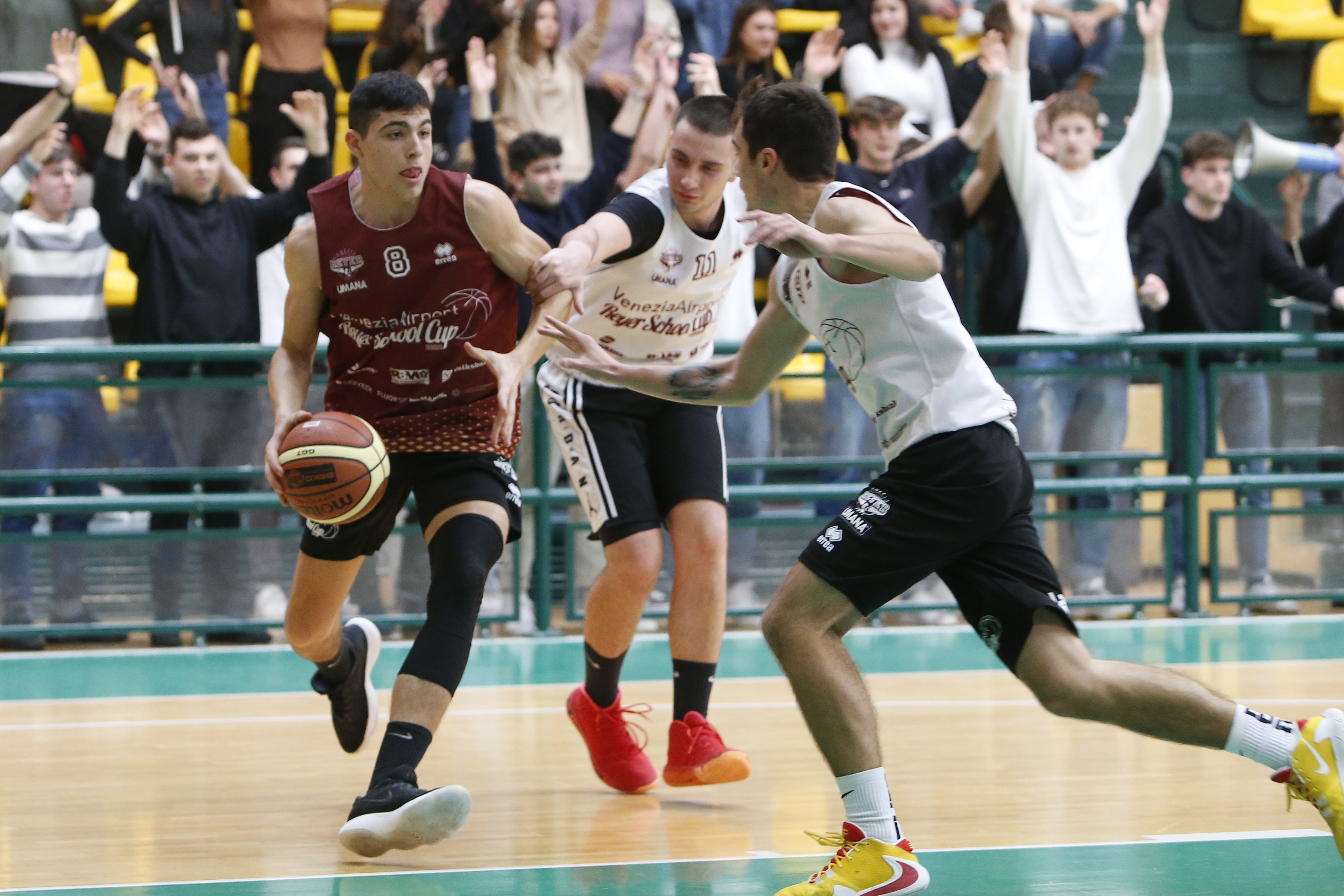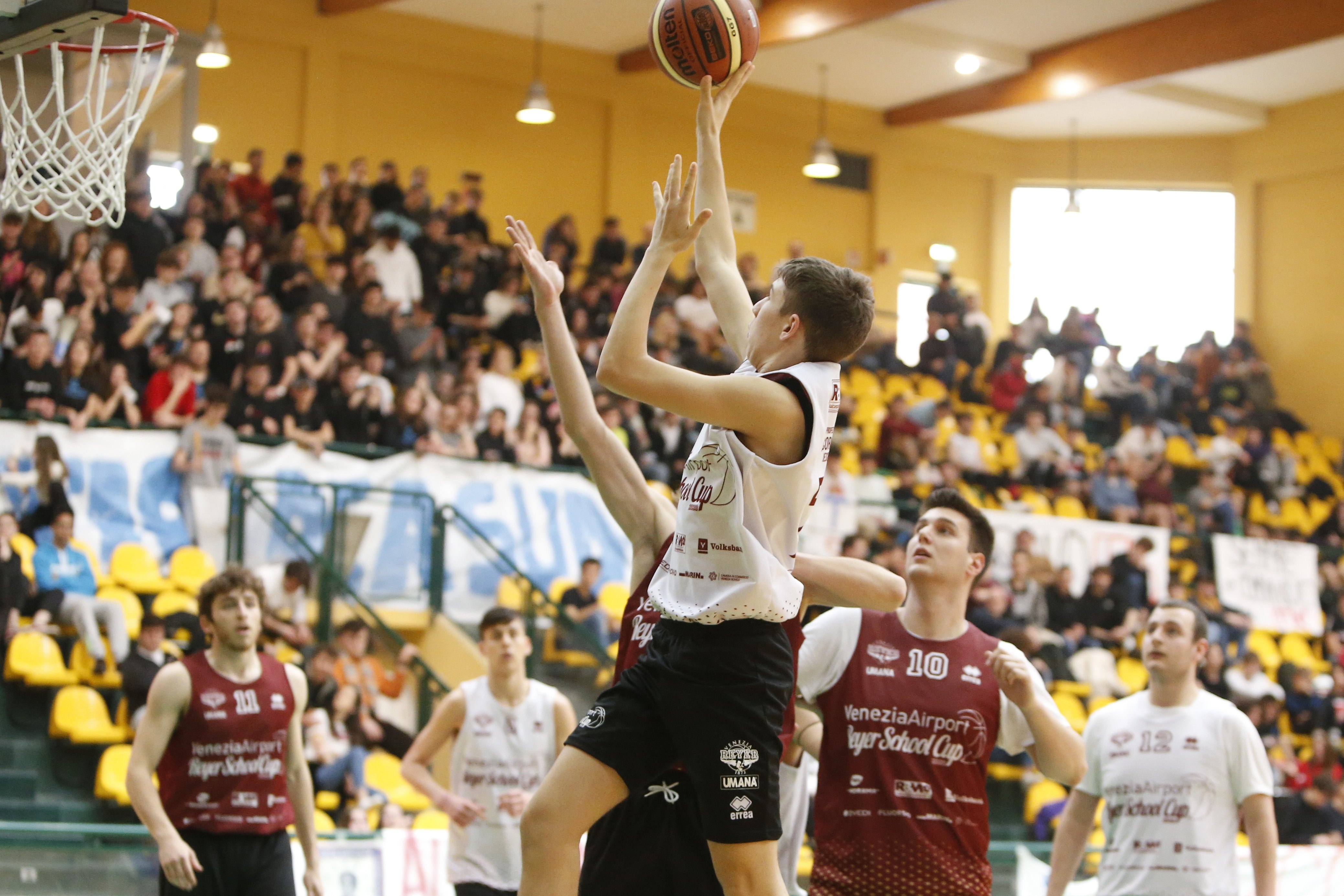 Serve un tempo supplementare per decidere un’altra appassionante sfida della tappa “Ducale Jesolo” della Venezia Airport Reyer School Cup. Alberti vicino alla qualificazione con il 34-33 nel nuovo derby sandonatese con il Galilei. Molti errori all’inizio (2-3 a metà tempo) e grande equilibrio, con continue situazioni di parità, finché il Galilei prende un sia pur minimo vantaggio (14-15) all’intervallo. I liceali mantengono il vantaggio fino a metà ripresa (18-19), poi si riprende con sorpassi e controsorpassi. L’Alberti arriva sul 26-23 agli ultimi 90”, in cui succede di tutto: segna Perissinotto e l’Alberti chiama time out sul 26-25 a -50”, sbaglia Carraretto, perde palla il Galilei, Carraretto fa 1/2 dalla lunetta per il 27-25 a -6”.  Dopo il time out Galilei, Ruggiero fa 1/2, Carraretto 2/2, ma Perissinotto segna dall’angolo la tripla del 29-29. Nel supplementare, Garbin firma il 34-29 per l’Alberti e il tentativo di ennesimo rientro del Galilei si ferma sul 34-33.